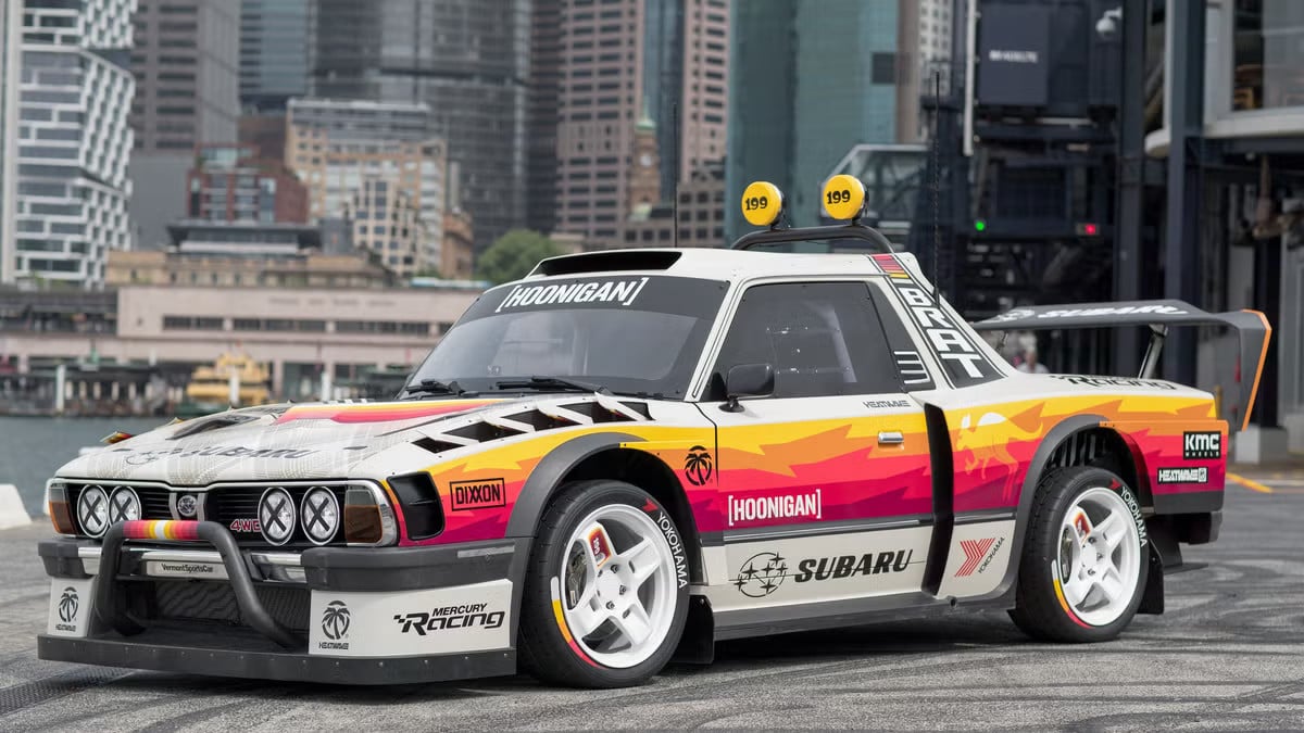 To handle the abuse of Pastrana’s driving, the Subaru’s chassis and safety systems are top-tier. Vermont SportsCar engineered a custom tube-frame chassis with a full roll cage built to current WRC (World Rally Championship) safety standards, hidden under the BRAT’s classic body shape. Speaking of the body, it’s completely bespoke. The Brataroo wears a lightweight carbon fiber widebody shell that retains the quirky look of the late-‘70s BRAT, but with a radical modern twist thanks to designer Khyzyl Saleem’s handiwork. Its livery pays homage to Subaru’s and Australia’s shared heritage: the paint scheme has a 1970s retro vibe with vintage Subaru logos, Outback sunset colors, and even kangaroo graphics giving a nod to the BRAT’s nickname “Brumby” in Australia. In fact, the very name “Brataroo” is a cheeky tribute to the land of roos; this Gymkhana build was conceived as a tribute to Subaru’s legacy Down Under and the fanbase that’s grown around the brand there.